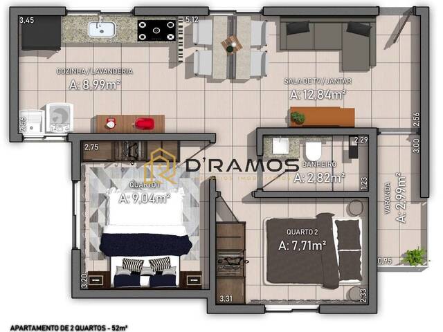 Apartamento contém 52,00 m2 + Garagem